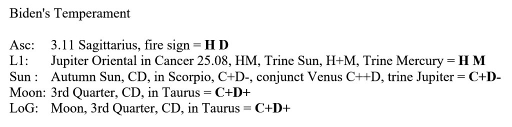 Biden has a mostly melancholic temperament. The key phrase for him is to “have and to hold” so stability, pragmatism, and persistence mean a lot to Biden. This makes sense for someone who has spent an entire lifetime in politics since the late 60s. He was a senator from ’73 to ’09, vice president for 8 years, and now on his 3rd run for president. This is certainly a man who “holds on” and with his angular houses being in mutable signs, he can be adaptable, when it is necessary. Biden is a real family man, not a pretend one, with his exalted Moon and Part of Fortune firmly placed in the 5th house. This shows a deeply rooted love and care for his children, which I’m sure has been a major motivating factor for him in life. Biden’s hang up is Lord 10 Mercury, combust and in the 12th house, giving him foot-in-mouth disease. His communication skills, or lack thereof, have been a source of undoing for his public image. With four of his planets, residing in the 12th house, he works a lot better behind the scenes, secretly, while nobody is looking, and by most accounts worked quite well behind Barack Obama.